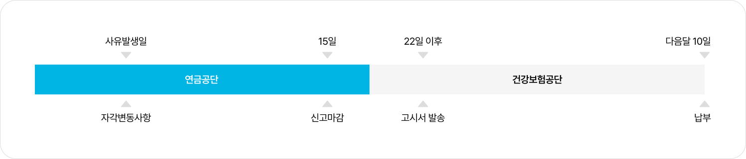 • 당월 15일까지의 자격변동신고를 기준으로 (국민연금공단에서) 보험료 산정 및 (건강보험공단에서) 매월 말일까지 사업장에서 고지서 송달